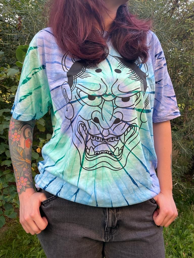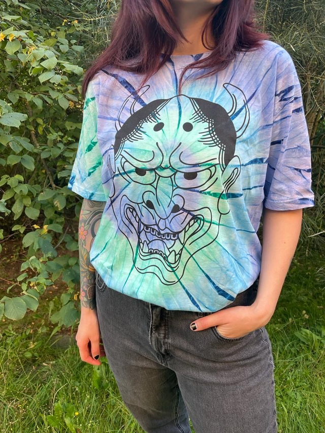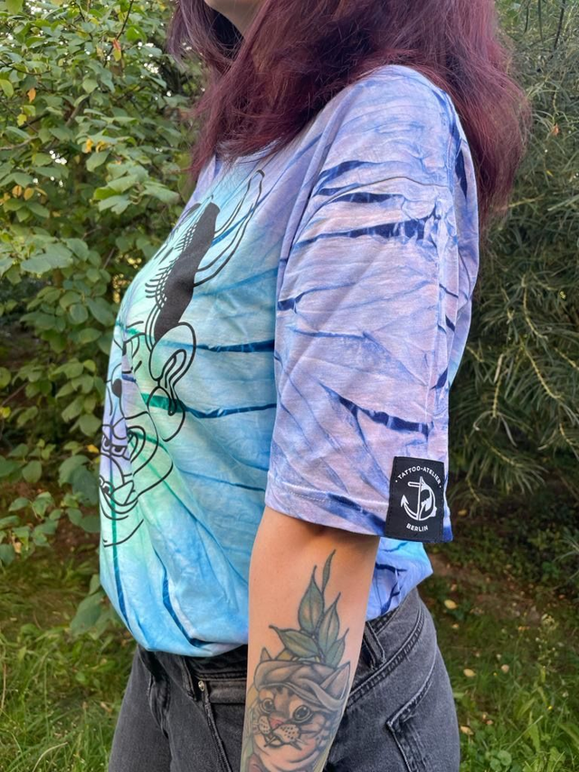 Batikshirt mit Hannyaprint. Siebdruck auf 100% Bio-Baumwolle. Jedes Shirt ist einzeln gebatikt und damit ein Unikat. Kleines Logopatch am Ärmel.